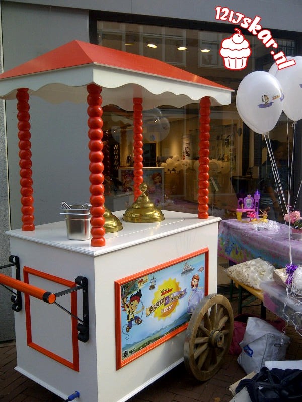 Een sfeervolle authentieke kar met koperen deksels en andere koperen details, uitgevoerd in de kleuren oranje en wit. Een stijlvolle ijskar met een fris uiterlijk. Natuurlijk missen ook bij deze kar de koperen deksels niet.