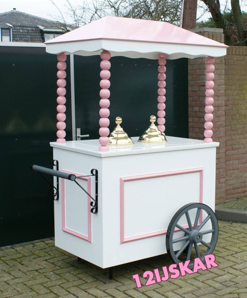 Een originele ijscokar, met een eigentijdse, moderne, maar toch authentieke uitstraling. Uitgevoerd in de kleuren roze, antraciet en wit. Een stijlvolle ijskar met een fris uiterlijk. Natuurlijk missen ook bij deze kar de koperen deksels niet.