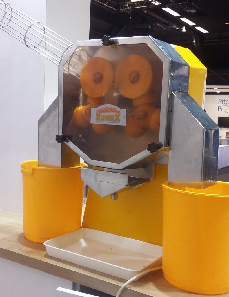 Wilt u honderden mensen snel kunnen voorzien van vers sinaasappelsap, dan gaat u dat niet redden met de gemiddelde professionele pers. Huur daarom nu onze grote pers, waar bijna volautomatisch elke paar seconden twee sinaasappels uitgeperst worden.